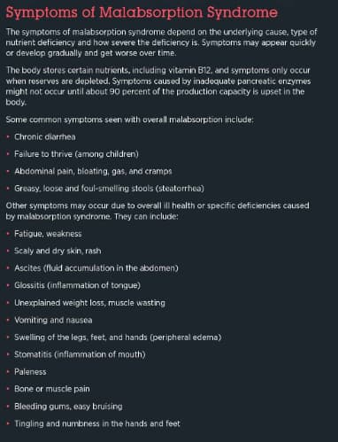- Malabsorption (poor uptake of fat, vitamins like B12; bloating and loose/greasy stools).